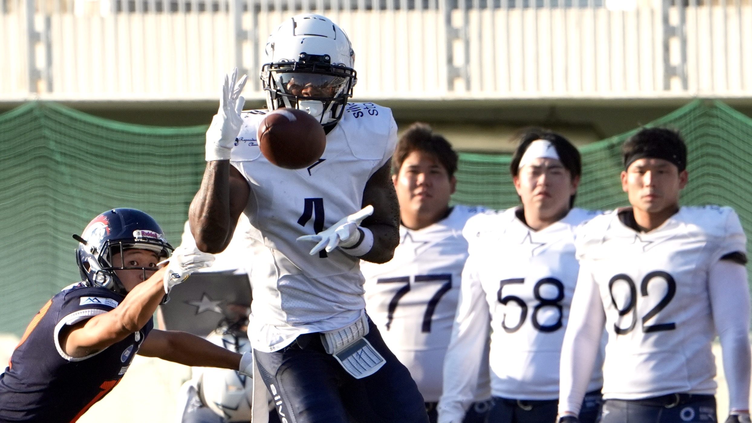 【パスキャッチするOrientalBioシルバースターWRデビン・フェルプス ©X LEAGUE】