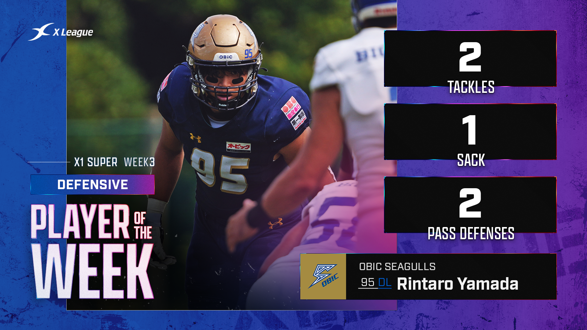 第3節のオービックはオフェンスが7つのタッチダウンをあげる一方で、ディフェンスはIBMオフェンスを完封しました(IBMのタッチダウンはキックオフリターンによるもの)。そのディフェンスからDL山田選手がディフェンス部門のMVPに選ばれました。ラッシュ力に定評のある山田選手ですが、第3クオーター終盤には11ヤードロスのQBサックを決めた直後のプレーで、パスキャッチしたレシーバーにロスタックルするパフォーマンスがありました。山田選手らしさが発揮された試合でした。