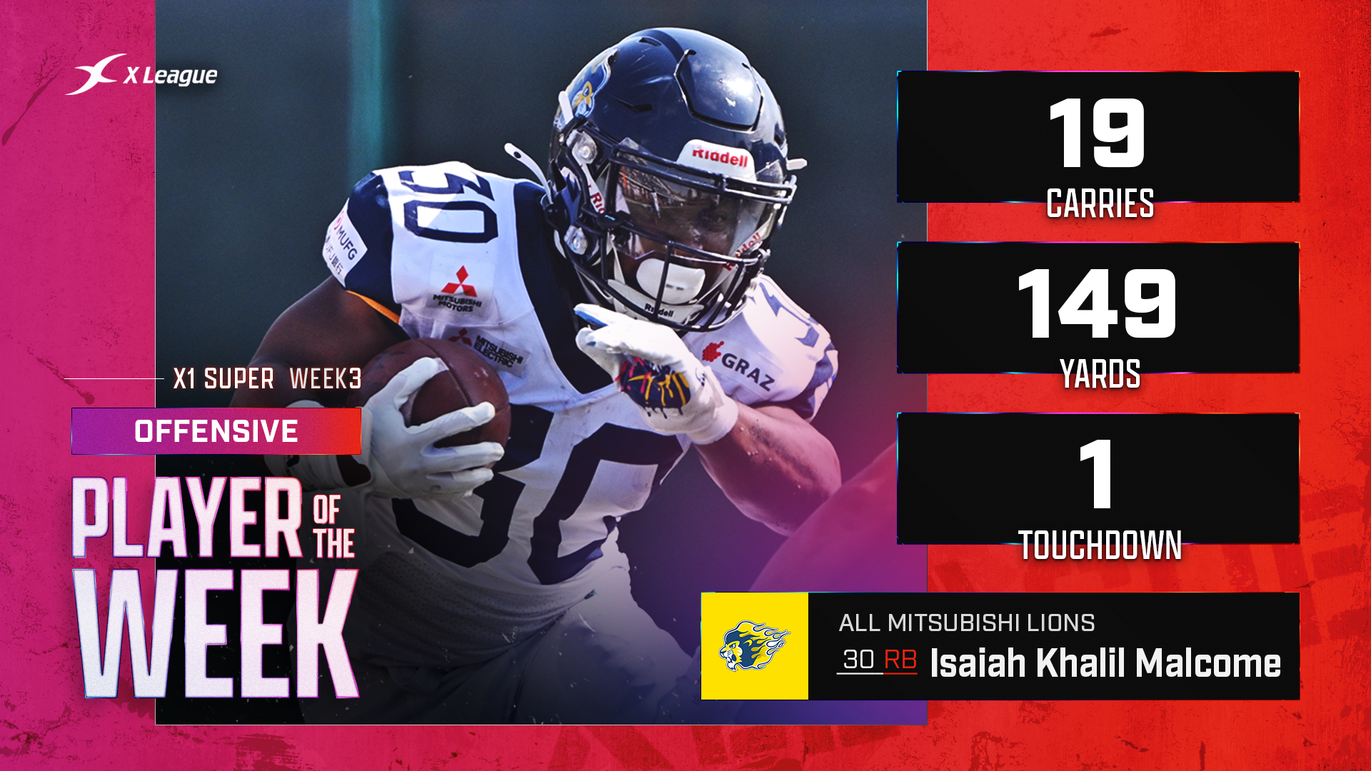 【X1 Super週間MVP】第3節は6年ぶりにX1 Superで勝利のオール三菱からRBマルコムが初選出 Play of the Weekは100ヤードキックオフリターンTD