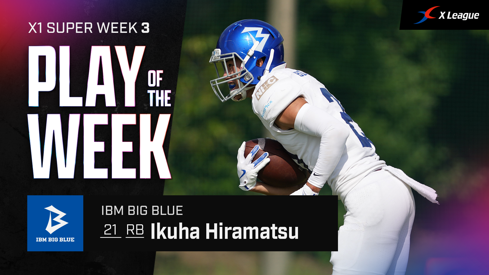 ビッグプレーやタッチダウン量産のパフォーマンスが多く生まれた第3節で、オフェンス部門の週間MVPに輝いたのはオール三菱の勝利に貢献したRBアイザイヤ・カリル・マルコム選手でした。2023年1月に国立競技場で行われたJapan U.S. Dream Bowlでアイビーリーグオールスターの一員として参戦してMVPに選ばれたマルコム選手(ペンシルベニア大出身)は来日3戦目にして初受賞です。また、Play of the WeekにはIBMの平松選手の100ヤードキックオフリターンが選ばれました。リターンプレーでしが実現しない100ヤードタッチダウンが生まれたプレーです。