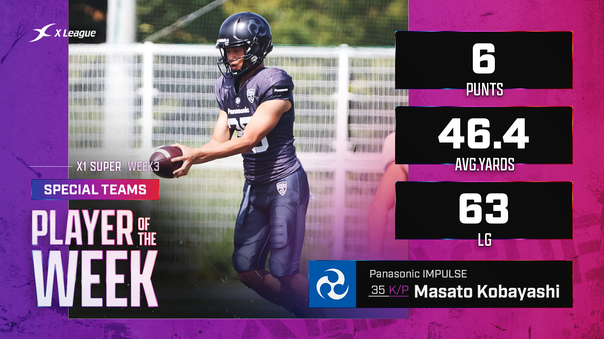オフェンスが5つのタッチダウンを決めて勝利する試合展開ではパントをする場面はあまり多くないものですが、第3節にエレコム神戸ファイニーズと対戦したパナソニックはサードダウンコンバージョン率が2/7(29%)と苦戦したため、P小林選手に5回のパント機会が巡ってきました。その合計は208ヤードで、平均46.4ヤードという安定した飛距離のパントを蹴りました。最長は63ヤード。オフェンスがファーストダウンを更新できない場面でも、長い距離のパントでしっかりとフィールドポジションバトルを有利に運んだことが分かる数字です。