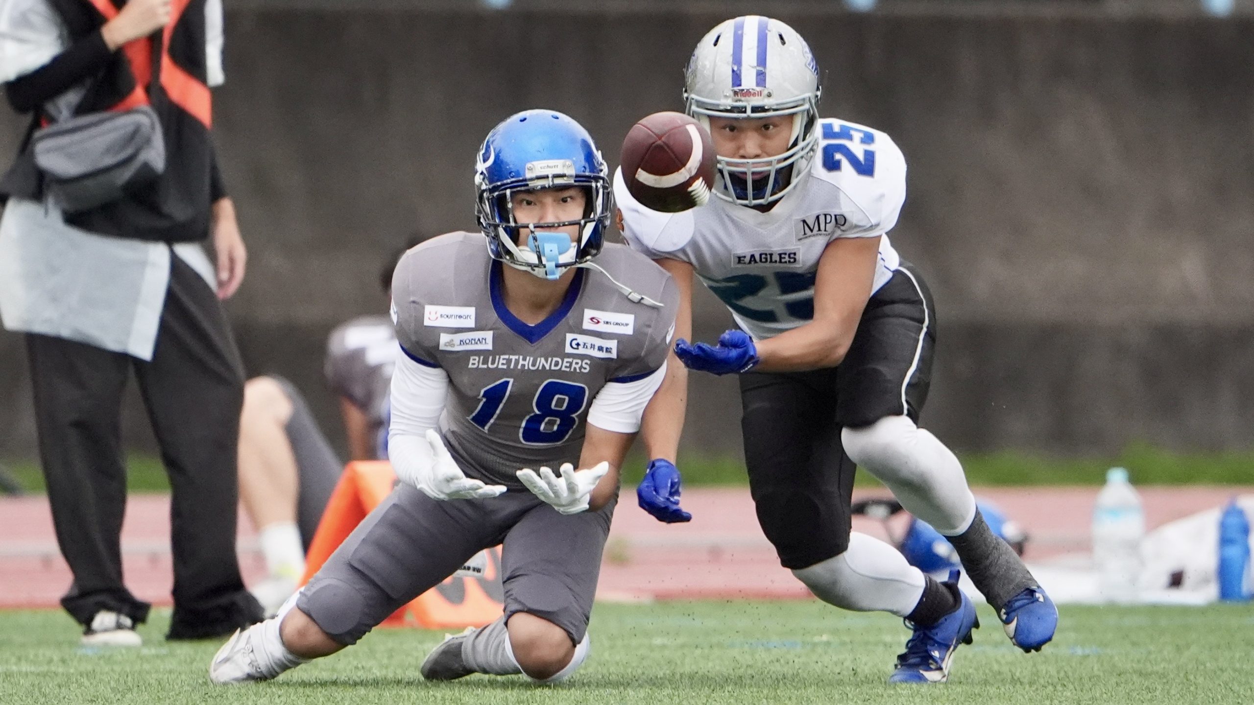 【パスキャッチの体勢に入るBLUE THUNDERS WR川口凌太郎(左)とインターセプトを狙う警視庁DB高橋遼太郎 ©X LEAGUE】