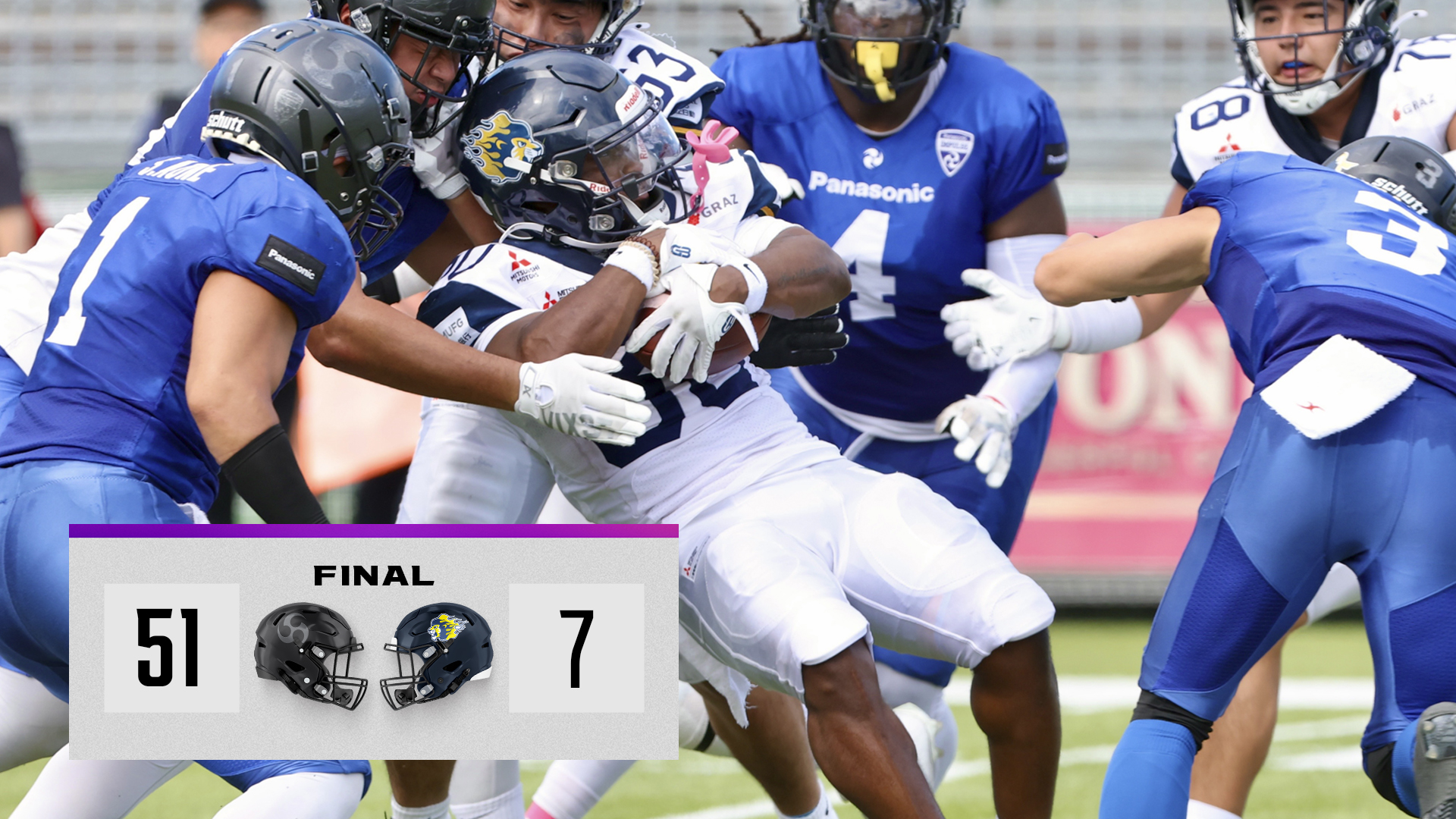 後半もRBミッチェルビクタージャモーとQB小林宏充のタッチダウンランで加点し、攻守で圧倒した。オール三菱は、連勝ならず今季成績が1勝3敗となった。