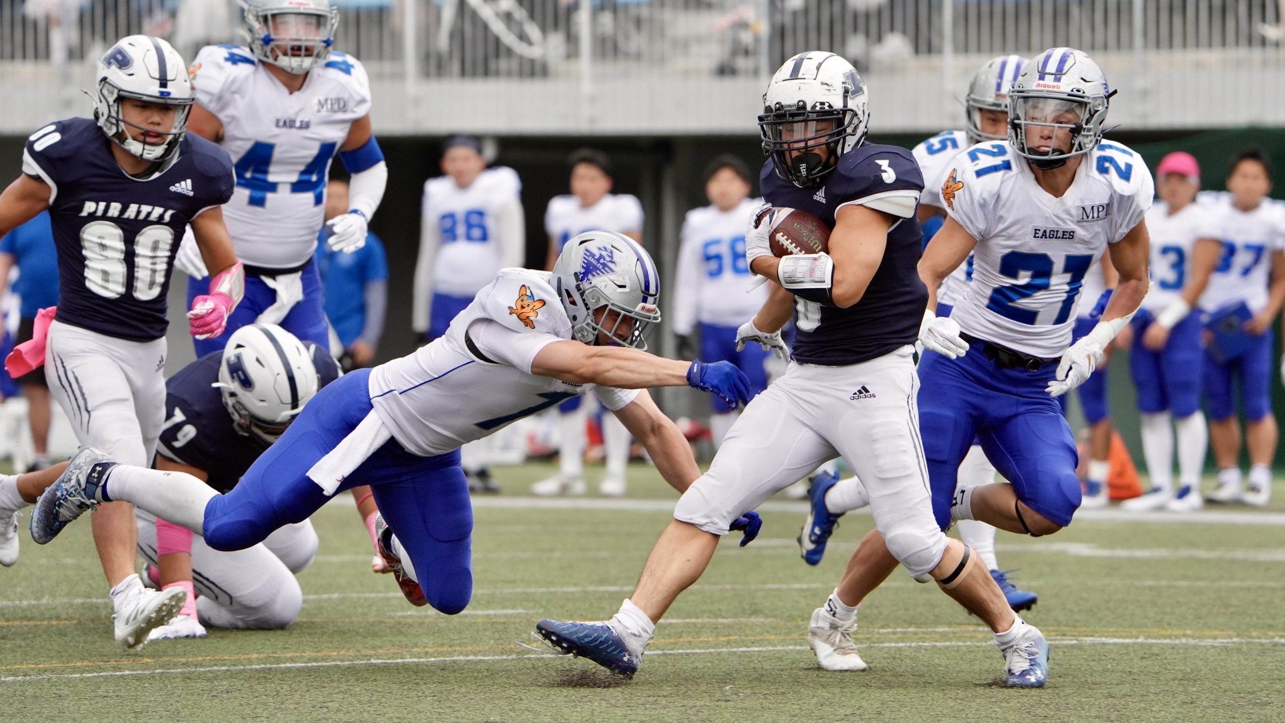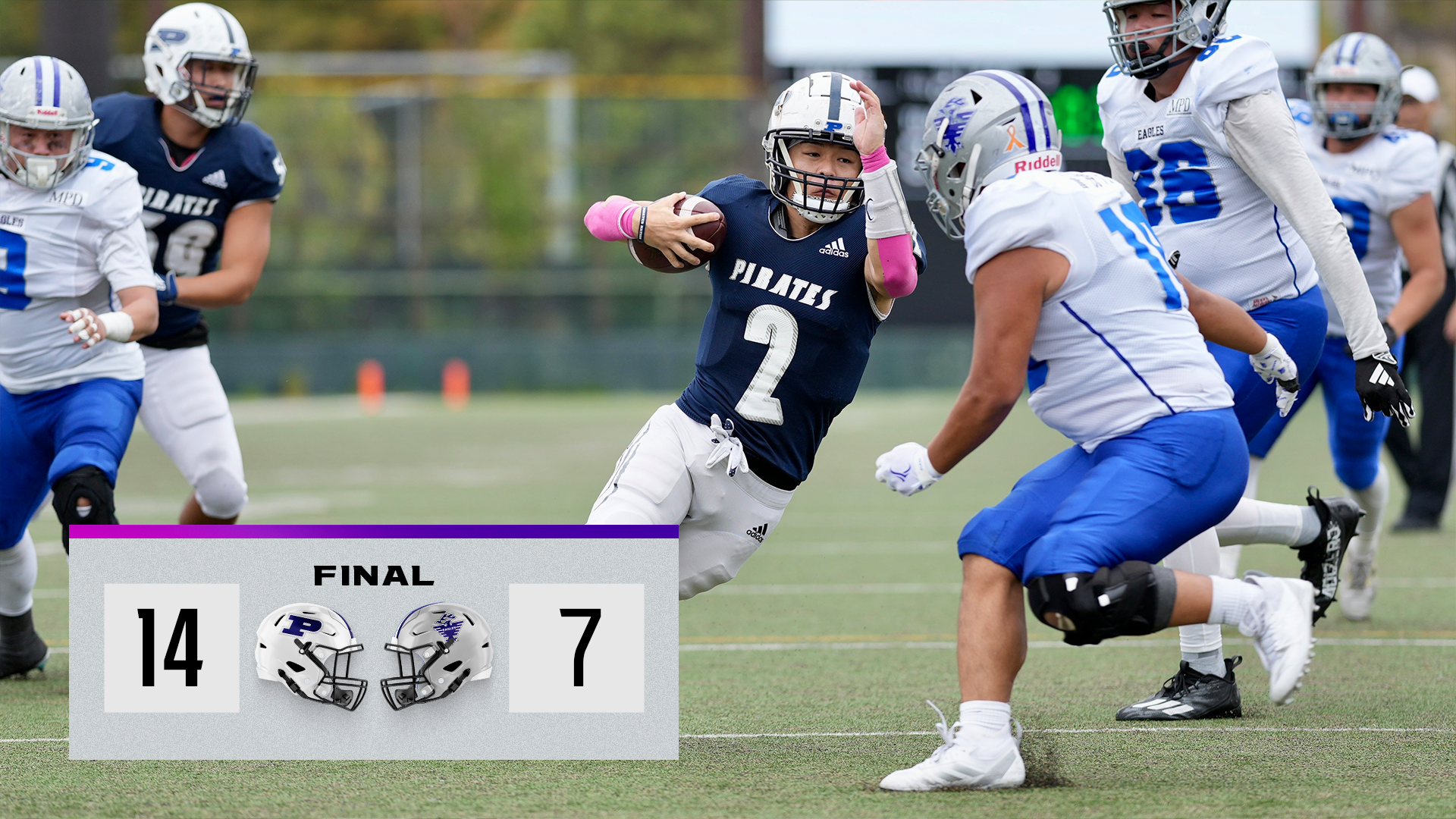 パイレーツはその直後にQB松田隆佑がWR野崎貴宏に3ヤードのスコアリングパスをヒットさせて同点。第2クオーターにはWR石原勇志のランプレーで逆転タッチダウンを決め、後半は警視庁のパスオフェンスを封じ込めて勝利した。