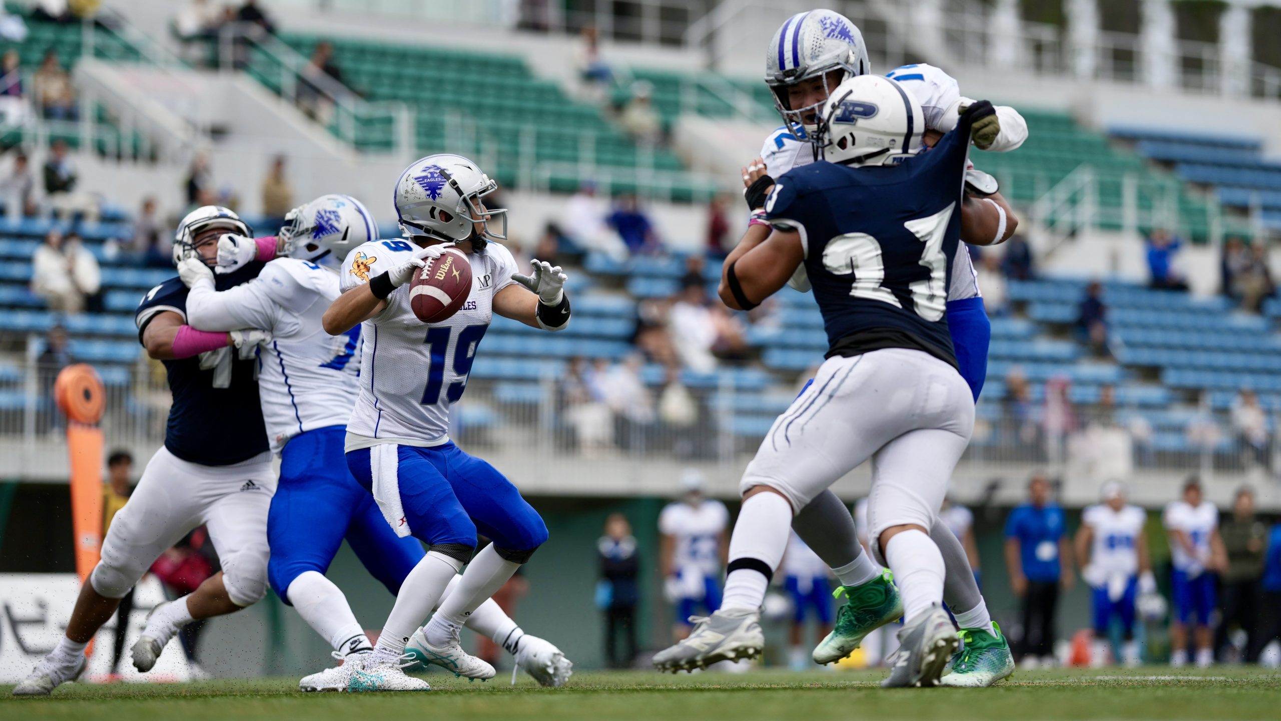 【パスを投げる警視庁イーグルスQB齋藤詩伸(中央) ©X LEAGUE】