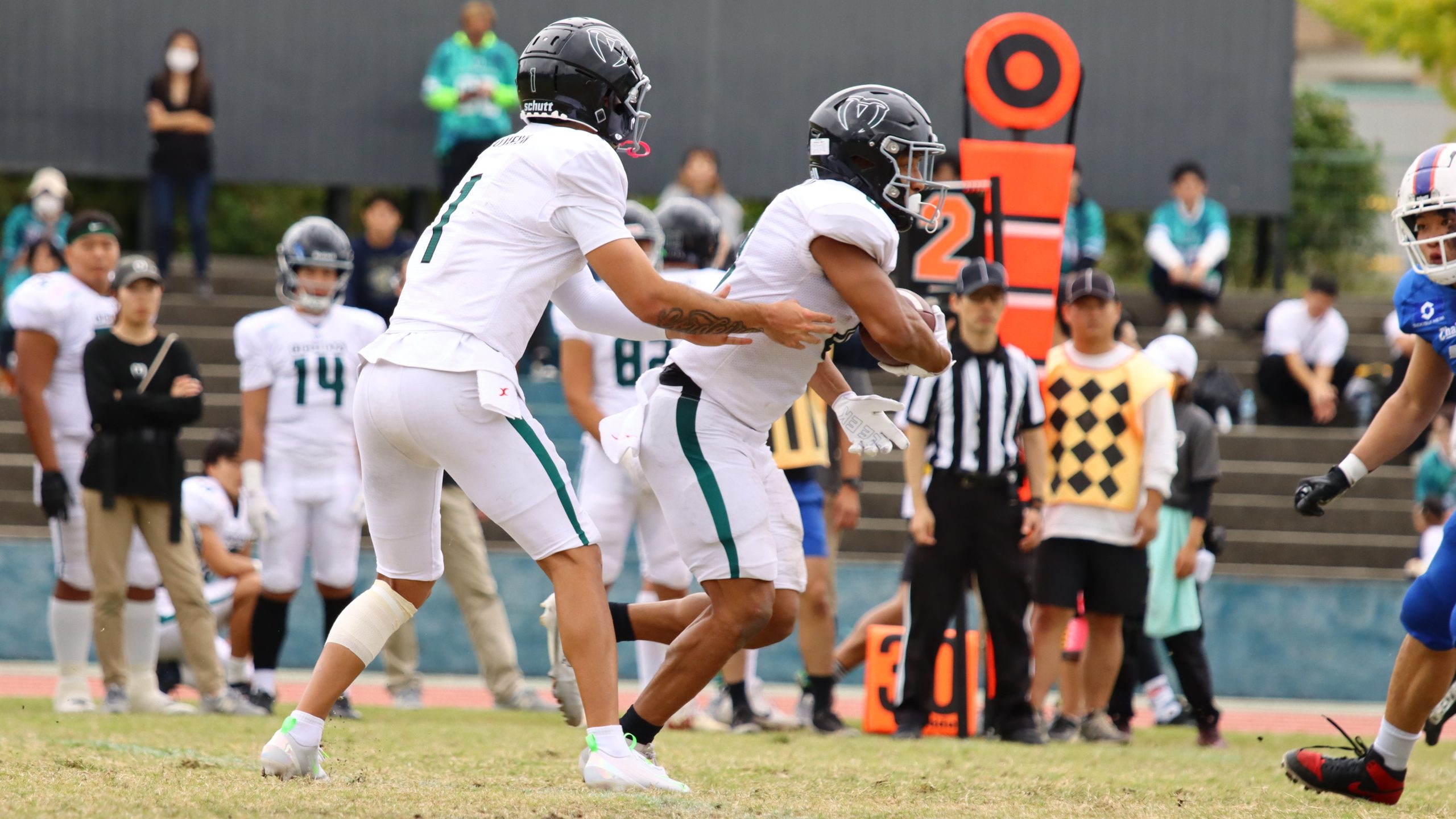 試合は第1クオーター、QBギャレット・サフロンがWRブギー・ナイトへ52ヤードのタッチダウンパスを通してSEKISUIが先制。さらにフィールドゴールで加点し10点をリードしたが、富士フイルム海老名もRBデレクアキラ・ウィリアムスの3ヤードタッチダウンランで応戦し、13対6で前半を折り返した。
