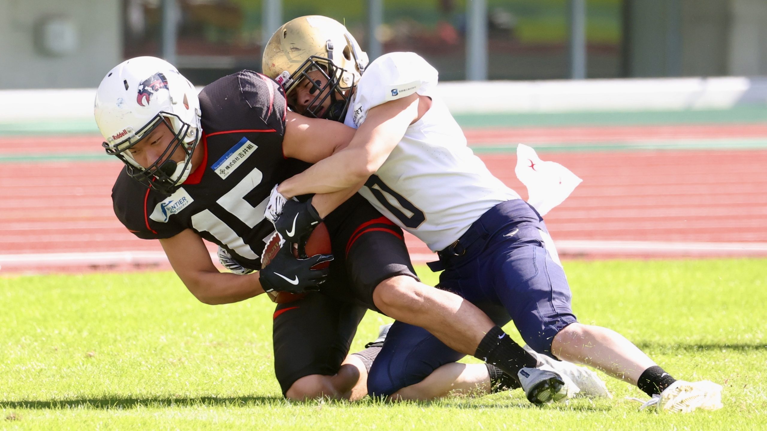 【アズワンの木下敬士(左)をタックルするリードエフォートDB岸田康暉 ©X LEAGUE】