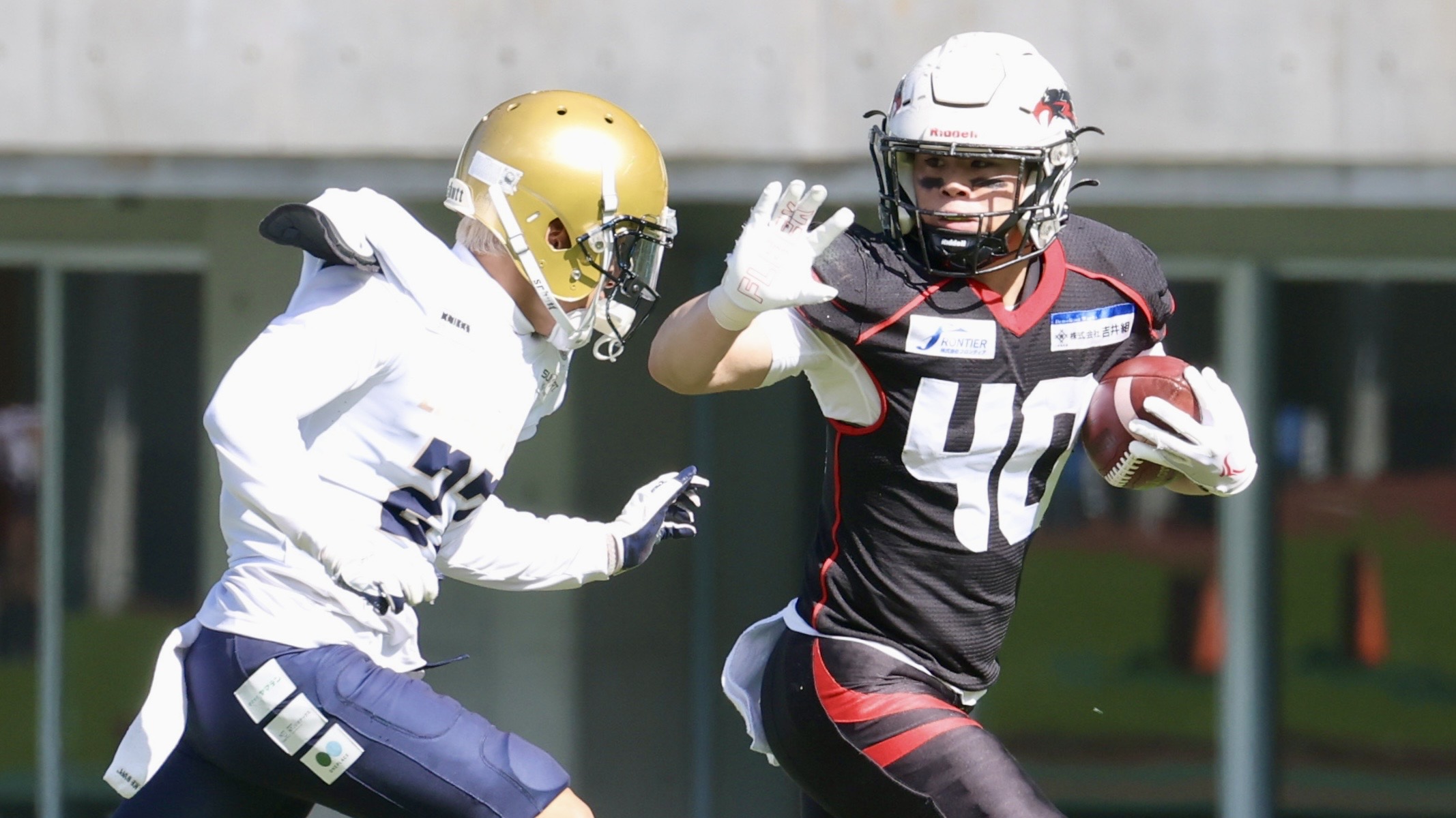 【タックラーをスティフアームでかわすアズワンの野村雄大(右) ©X LEAGUE】