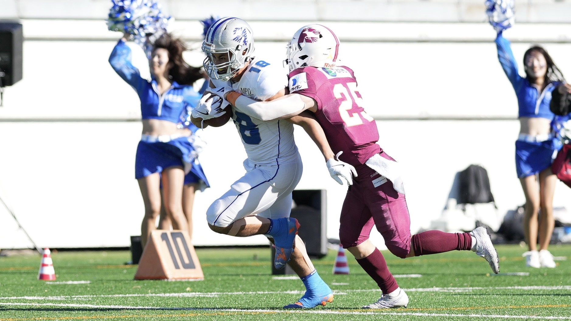 【パスキャッチの後タックルを受ける警視庁イーグルスWR清水翔太(左) ©X LEAGUE】