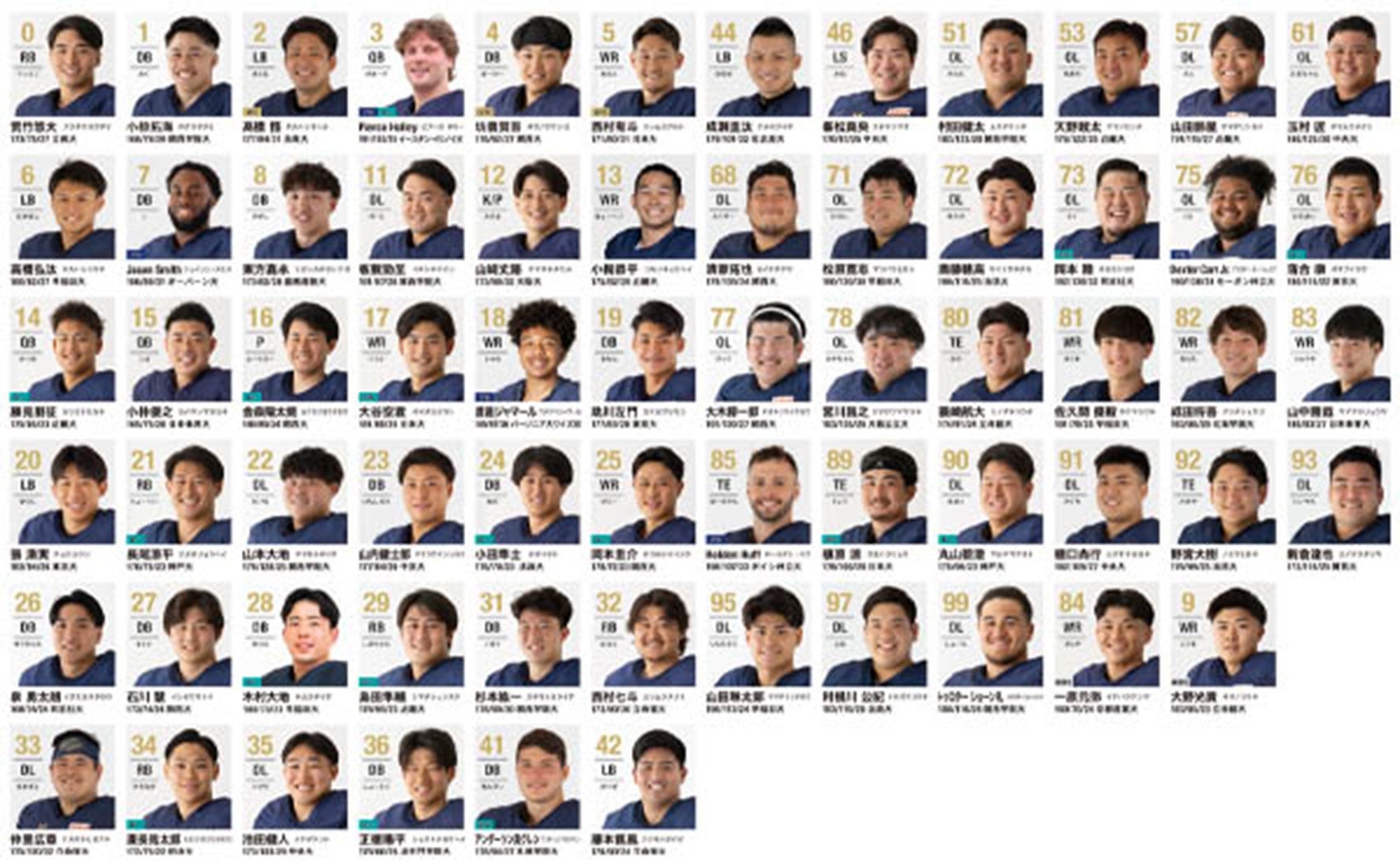 | 見どころ | オービックは2年目のDLトゥロターション礼ら前線が波に乗り、守備の圧力が試合の軸。攻撃ではQBピアース・ホリーとWR陣の連携が鍵となる。一方、ノジマ相模原はQBカート・パランデックによるテンポの良いパス攻撃が武器。WRテイ・カニンガムを守備がどう抑えるかがポイント。両者とも既に上位進出の可能性は高いが、シード権や勢いを持ってトーナメントに入るためにも落とせない最終節となる。 |