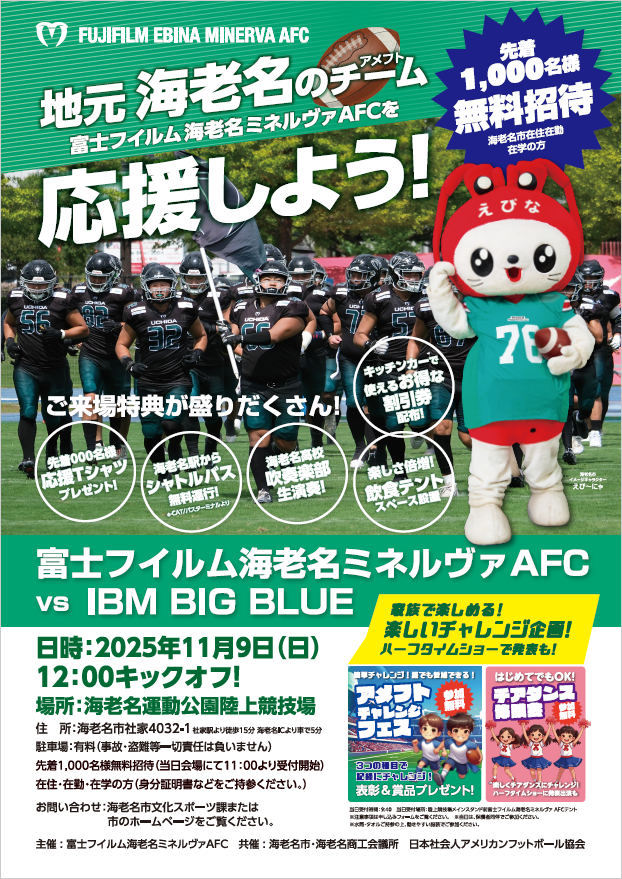 【X1 Super第6節】11/9(日)富士フイルム海老名Minerva AFC対IBM BIG BLUE戦のご案内
