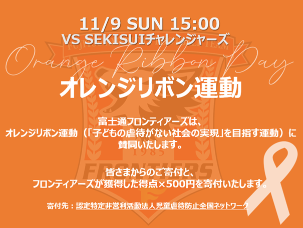 富士通フロンティアーズは、オレンジリボン運動(「子どもの虐待がない社会の実現」を目指す運動)に賛同し、その証として推進月間に当たる11月の試合では、募金活動を実施いたします。