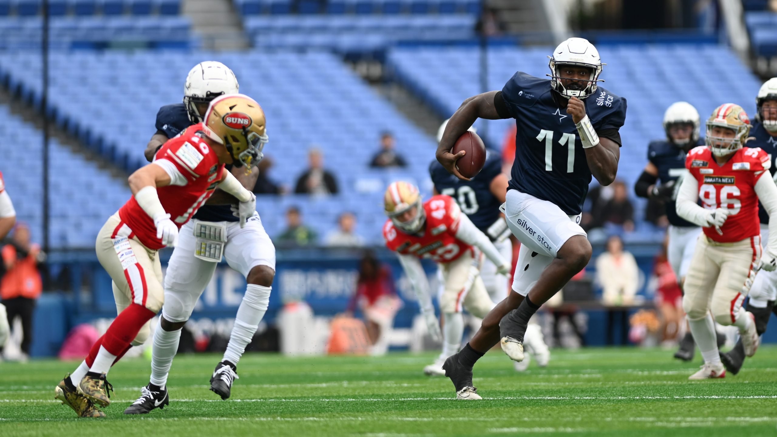 【スクランブルで走るOrientalBioシルバースターQBドノバン・アイソム(左) ©X LEAGUE】
