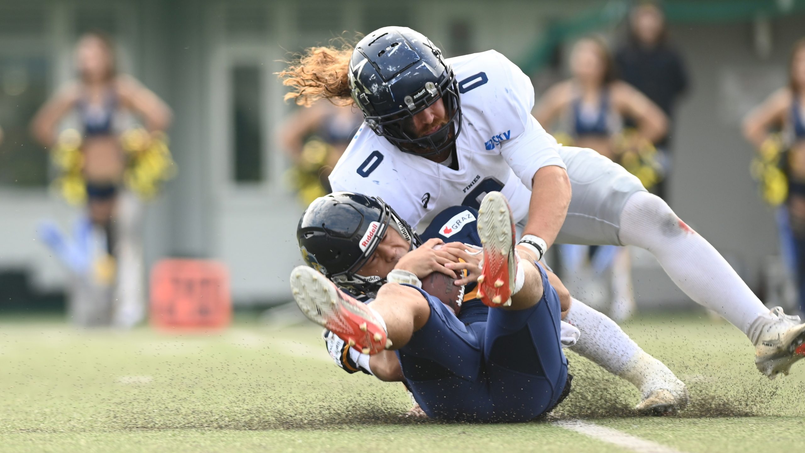 【オール三菱の最後の攻撃でQB水越直をサックするエレコム神戸LB子ルビー・キャンベル(背番号0) ©X LEAGUE】