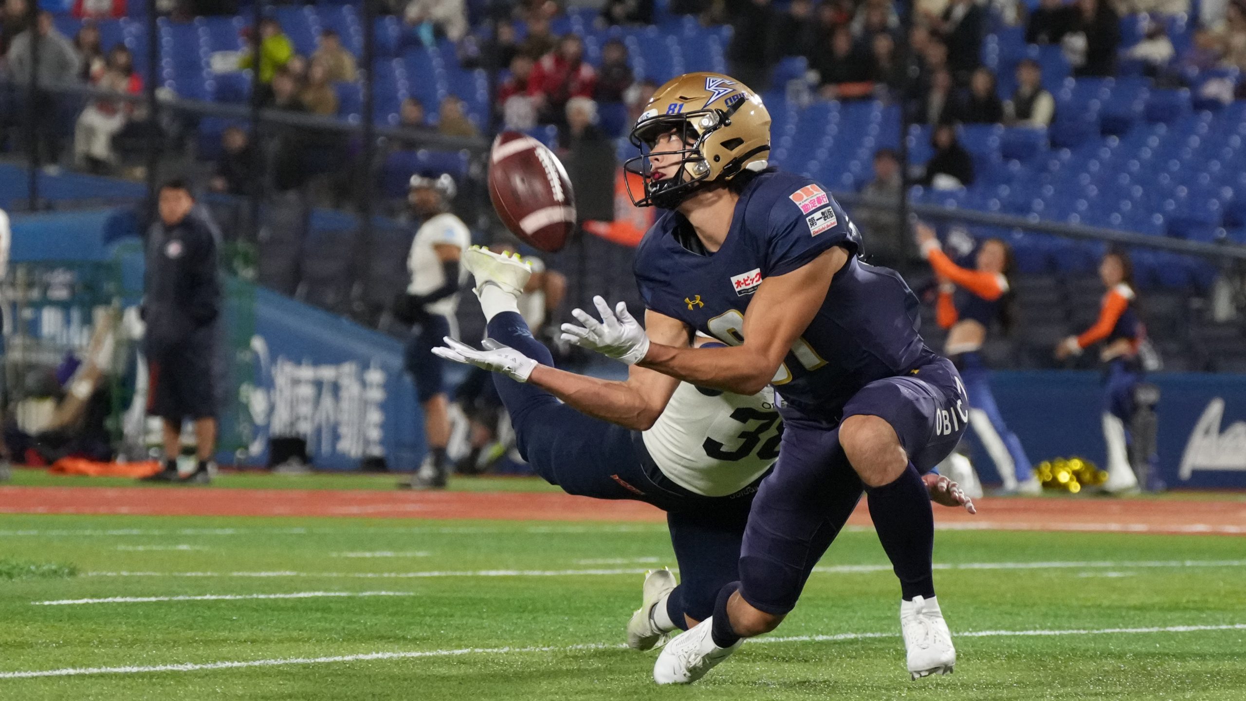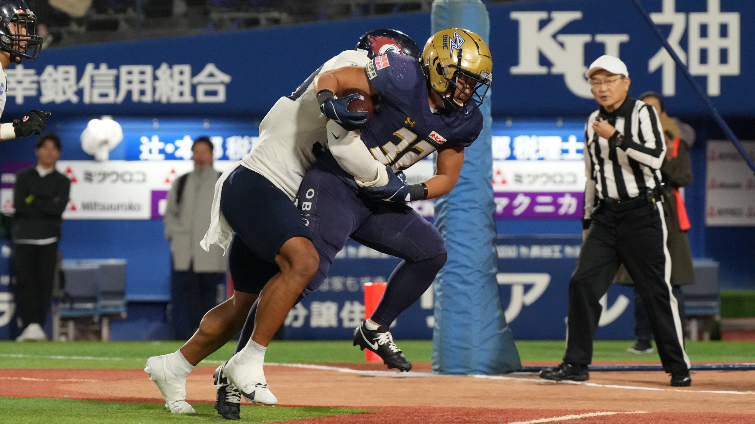 試合を決めたのは、QBピアース・ホリーからWR佐久間優毅への46ヤードタッチダウンパス。塚田HCは「ロングターゲットは佐久間の方が多い。最も自信のあるプレーでした」と振り返る。だがその直後には苦笑まじりにこうも漏らした。「ちょっと早く決めすぎましたね。本当は時間を使わないといけないと分かっていたんですが、負けている時は我慢できなくて……。」