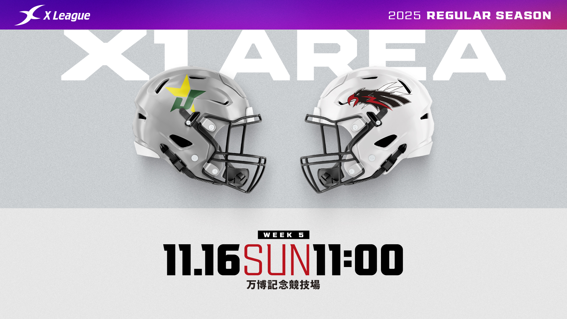 | 見どころ | J-STARSのRB斎藤陸は現在X1 Areaのリーディングラッシャー(307ヤード)。守備の堅いアズワンをどう攻略するか。前回対戦は16対16の引き分けに終わった。現在はアズワンがディビジョン2位、J-STARSが3位だが、残り2節で逆転で1位になるためには共に負けられない試合だ。 |