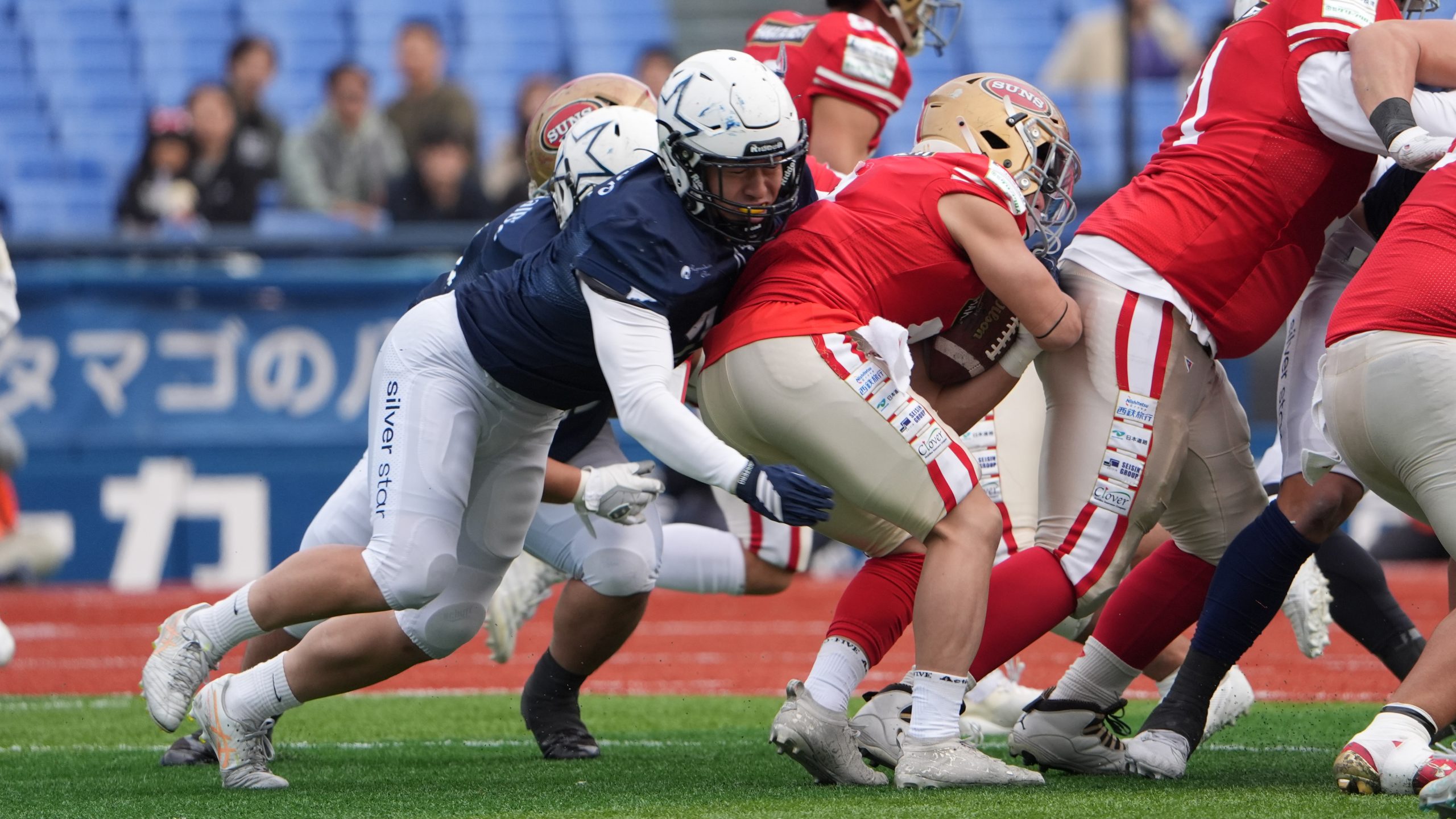 2016シーズンに指揮を執り、そこから9季ぶりの復帰。開幕から白星をつかめないまま迎えた最終戦は、まさに意地と誇りのぶつかり合いだった。立ち上がりはロングゲインのタッチダウンを奪うなど2タッチダウンを挙げたが、第2クオーターは無得点。後半にはスカウティングの徹底で弱点を突かれ、防戦一方の時間も続いた。それでも岡HCは「ディフェンスを信じていた」。その信頼に応えるように、選手たちは最後の13ヤードを守り切った。