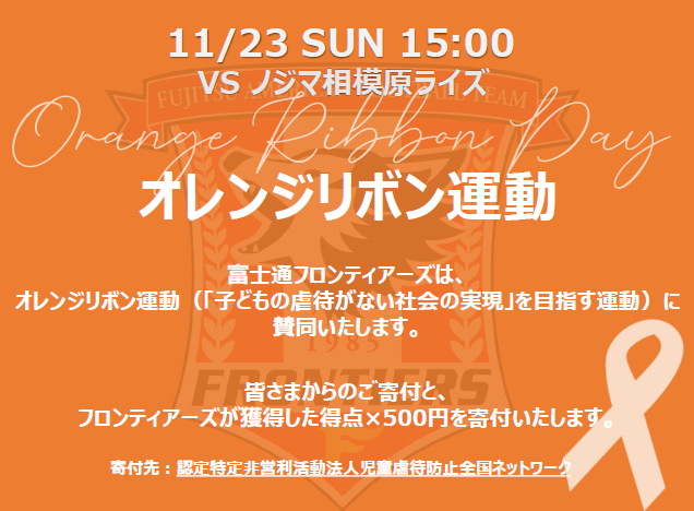 富士通フロンティアーズは、オレンジリボン運動(「子どもの虐待がない社会の実現」を目指す運動)に賛同し、その証として推進月間に当たる11月の試合では、募金活動を実施いたします。