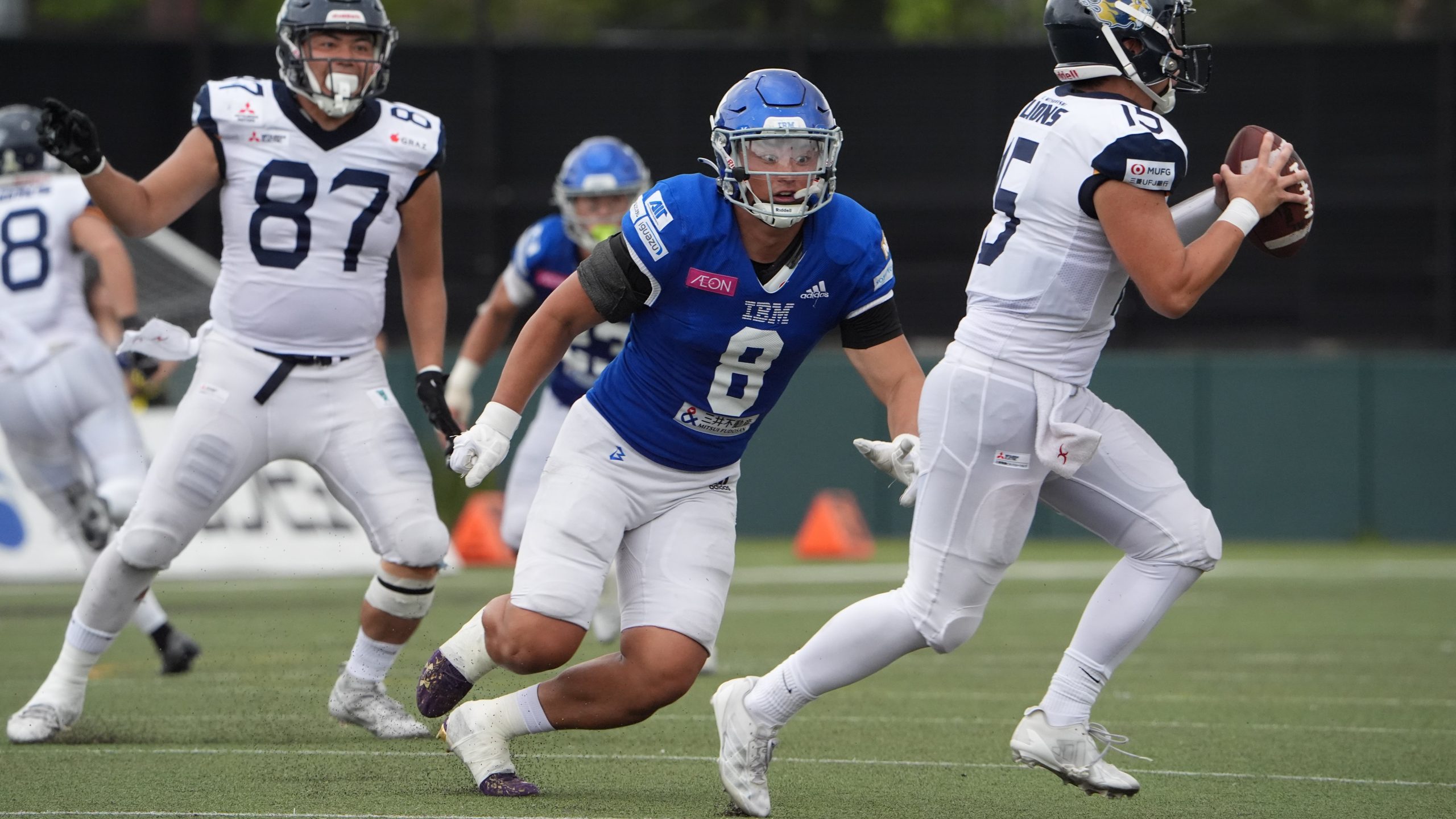 【QBにプレッシャーをかけるIBMのLB文字大河(中央) ©X LEAGUE】