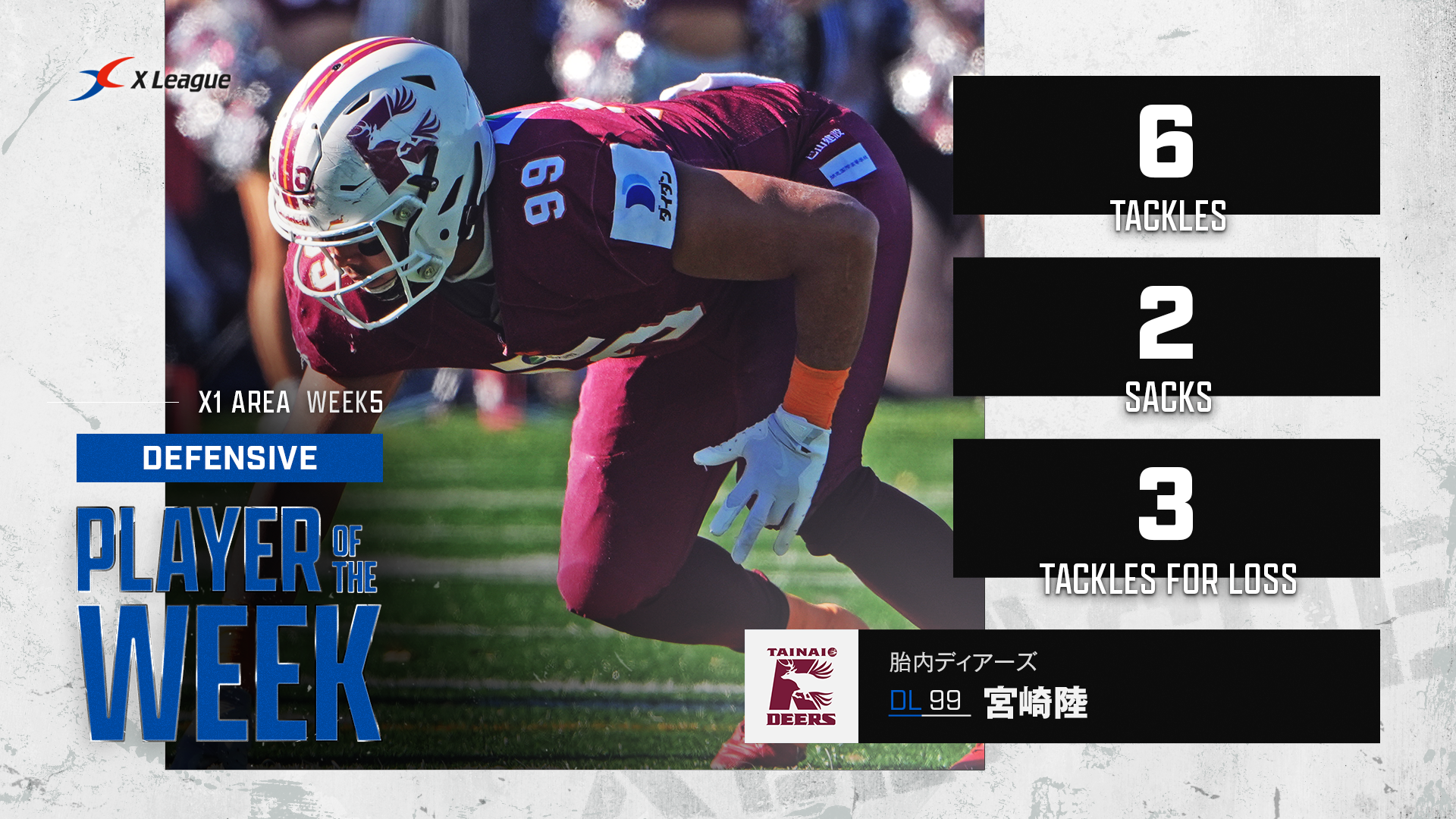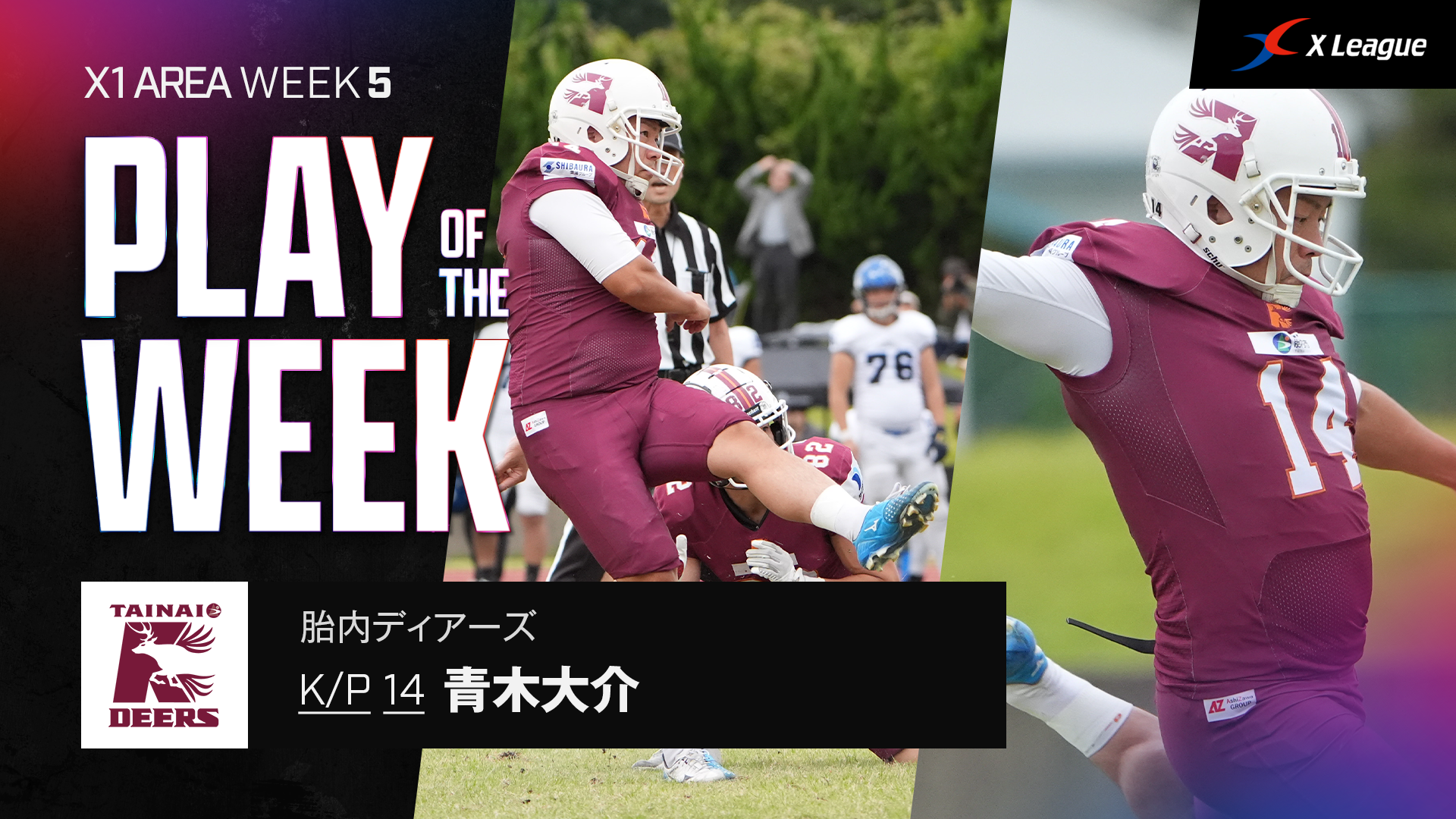 2025年11月21日(金) 18:00X1 Areaは第5節を終了して、CENTRALの胎内DEERSとWESTの名古屋サイクロンズがそれぞれ最終節を待たずにディビジョン1位が確定しました。胎内はEASTディビジョン1位と対戦するX1 Area東日本チャンピオンシップ(12月20日、富士通スタジアム川崎、12:00キックオフ)に出場します。第5節の週間MVPは4部門のうち3つでこの2チームの選手が選ばれました。オフェンスは驚異的なラッシング距離を記録したRB境田貴琉選手(名古屋)、ディフェンスはマルチサックのDL宮崎陸選手(胎内)、スペシャルチームは3つのFGをすべて決めた花岡輝選手(TRIAXIS J-STARS)がそれぞれ選出されました。そして、Play of the Weekには胎内のK青木大介選手が蹴った52ヤードのFGに決まりました。Play of the Weekにフィールドゴールが選ばれるのは珍しく、52ヤードという長距離のキックが評価されました。