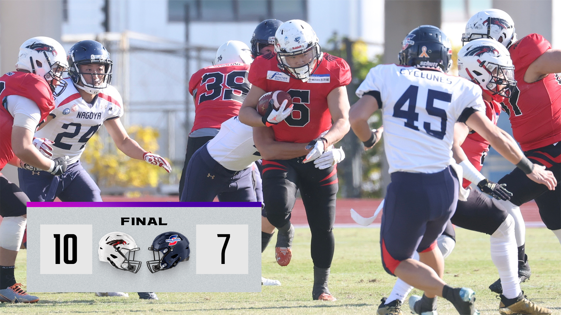 X1 Areaレギュラーシーズン第6節最終日は30日、万博記念競技場でアズワンブラックイーグルスと名古屋サイクロンズが対戦。すでにWESTディビジョン1位を決めている名古屋は無敗のままのシーズン終了を目指したが、昨季1位のアズワンが意地を見せ、10対7で勝利した。