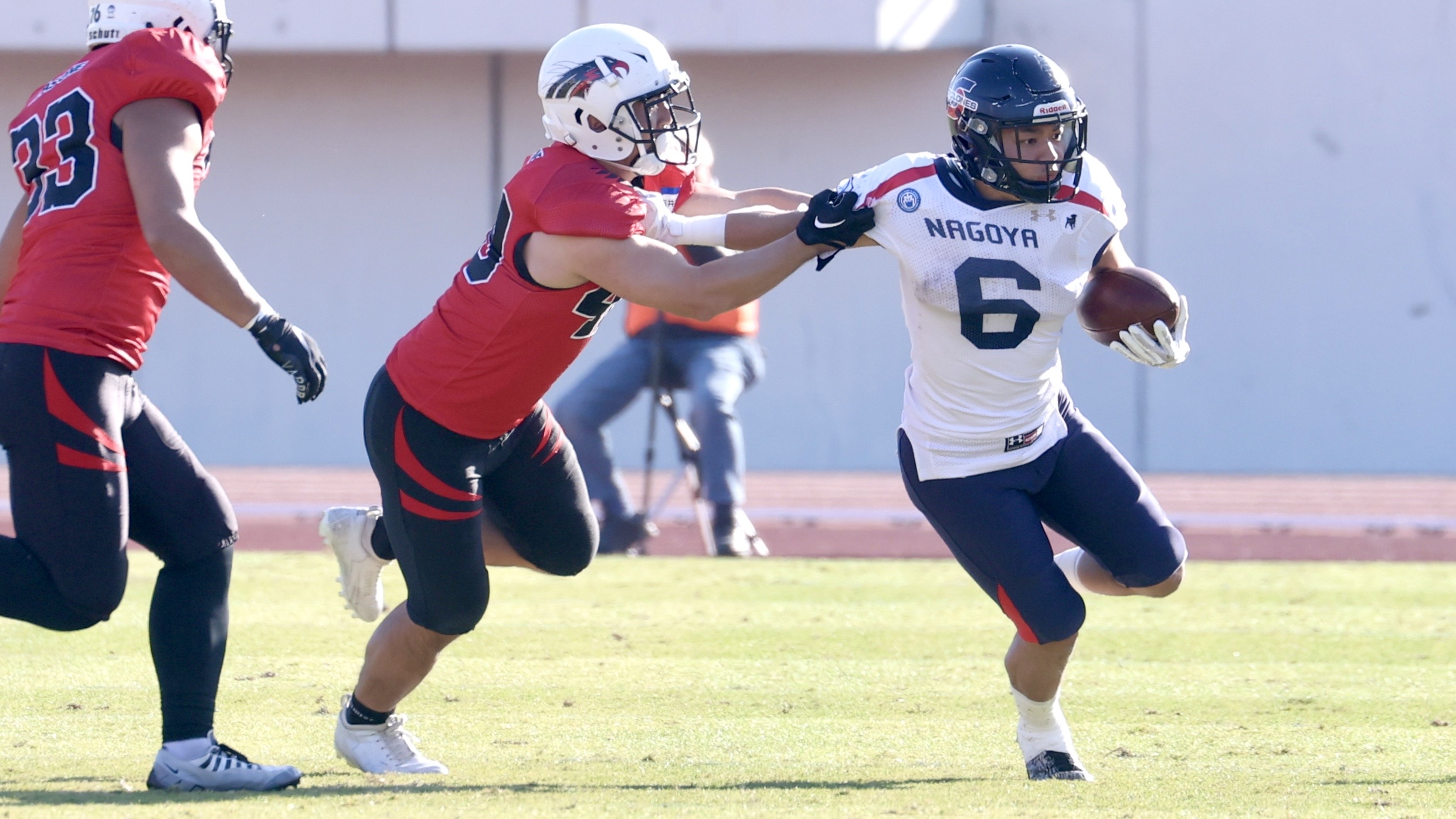 【アズワンディフェンダーのタックルを受ける名古屋RB針ケ谷優太(右) ©X LEAGUE】