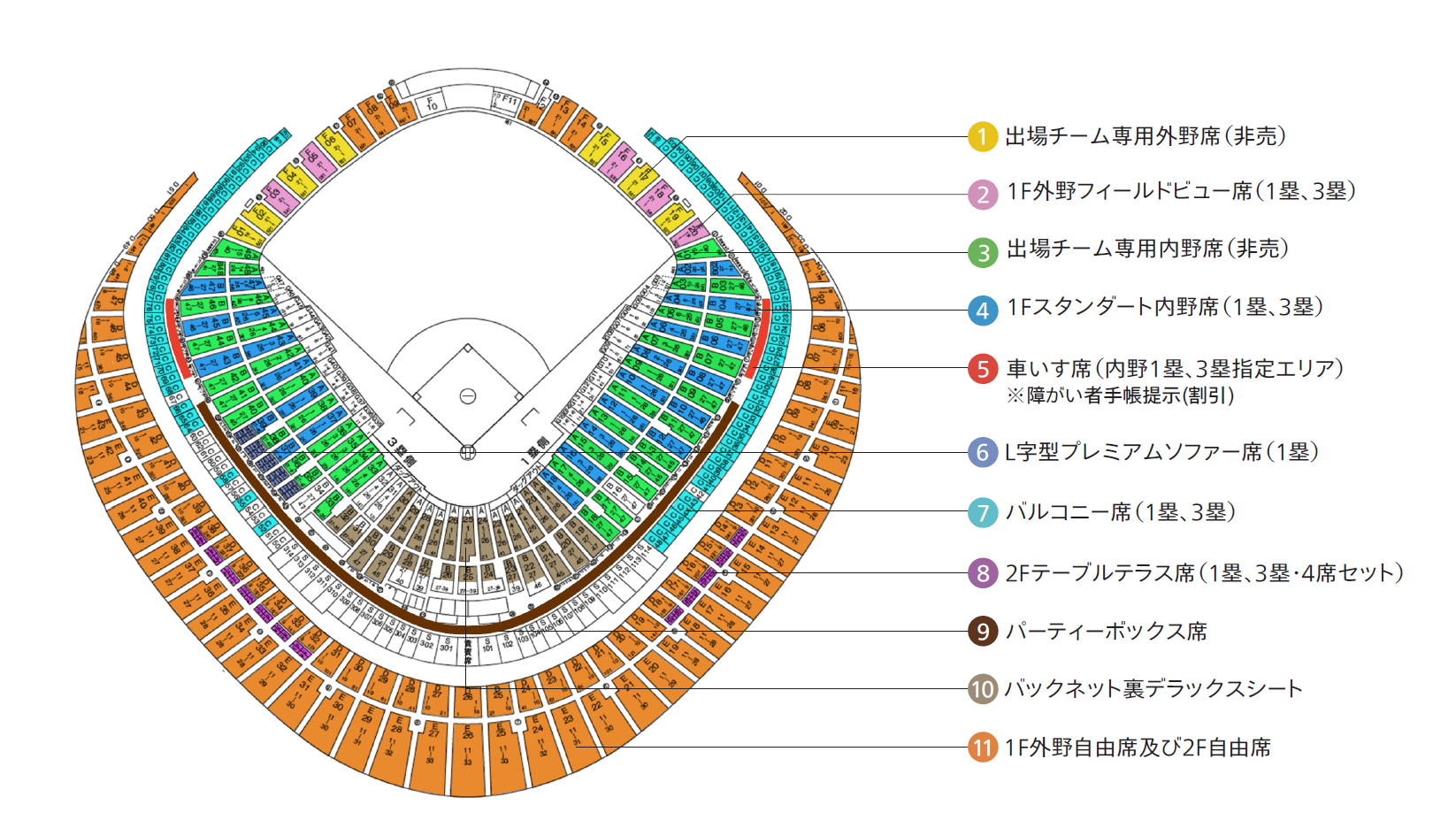 ■販売席:外野フィールドビュー席(1塁・3塁側)、1Fスタンダード内野席(1塁・3塁側)、バルコニー席食事あり/なし、バックネット裏デラックスシート、パーティーボックス席、L字型プレミアムソファー席(4席仕様)、1F外野自由席及び2階自由席、2Fテーブル付きテラス席(4枚セット、3塁側のみ5枚セットあり)