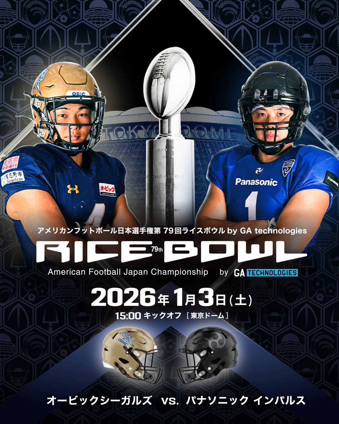 2025年度のアメリカンフットボール日本一を決める日本選手権第79回ライスボウル by GA technologies(来年1月3日、東京ドーム、15時キックオフ)の対戦カードはパナソニック インパルス対オービックシーガルズに決定した。ライスボウルで同カードが実現するのは初めて。