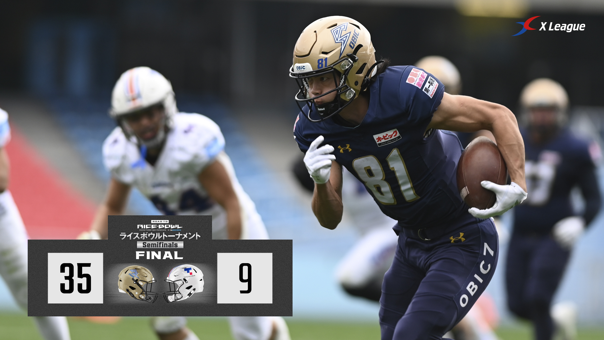 第1Qから主導権を握ったオービックは、QBピアース・ホリーのパスを起点にテンポ良く前進し着実に得点を重ねた。ファーストドライブでは、QBホリーからWR西村有斗への27ヤードタッチダウンパスで先制。続くシリーズではファンブルリカバーで攻撃権を奪い、敵陣ゴール前の好機をQBホリーからWR佐久間優毅への6ヤードタッチダウンパスにつなげた。その後は東京ガスに2本のフィールドゴールを許したが、前半終了間際にQBホリーがこの日3本目のタッチダウンパスを決め、21対6で折り返す。