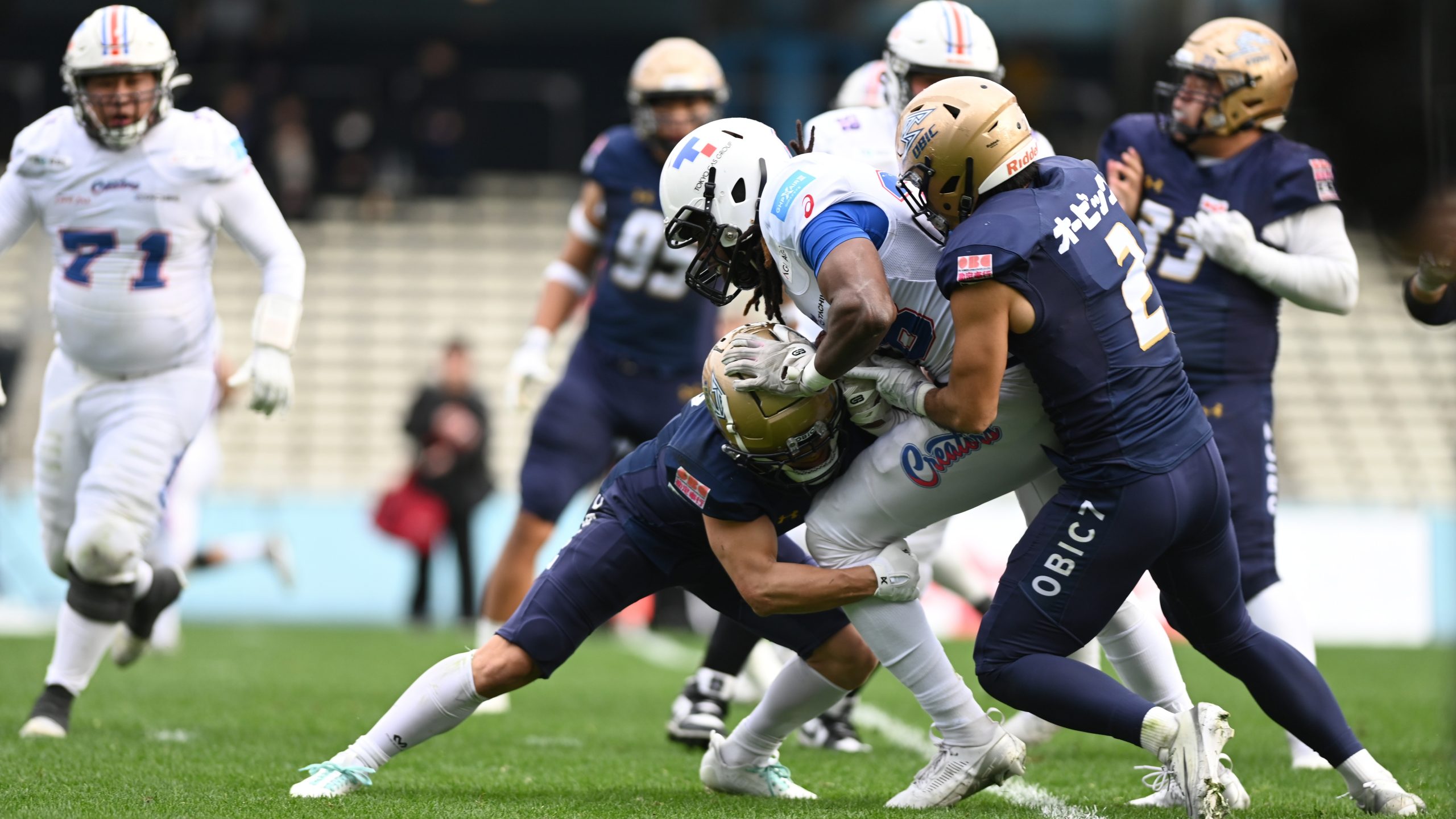 【東京ガスWRジャスティン・ホッブスをタックルするオービック守備陣 ©X LEAGUE】