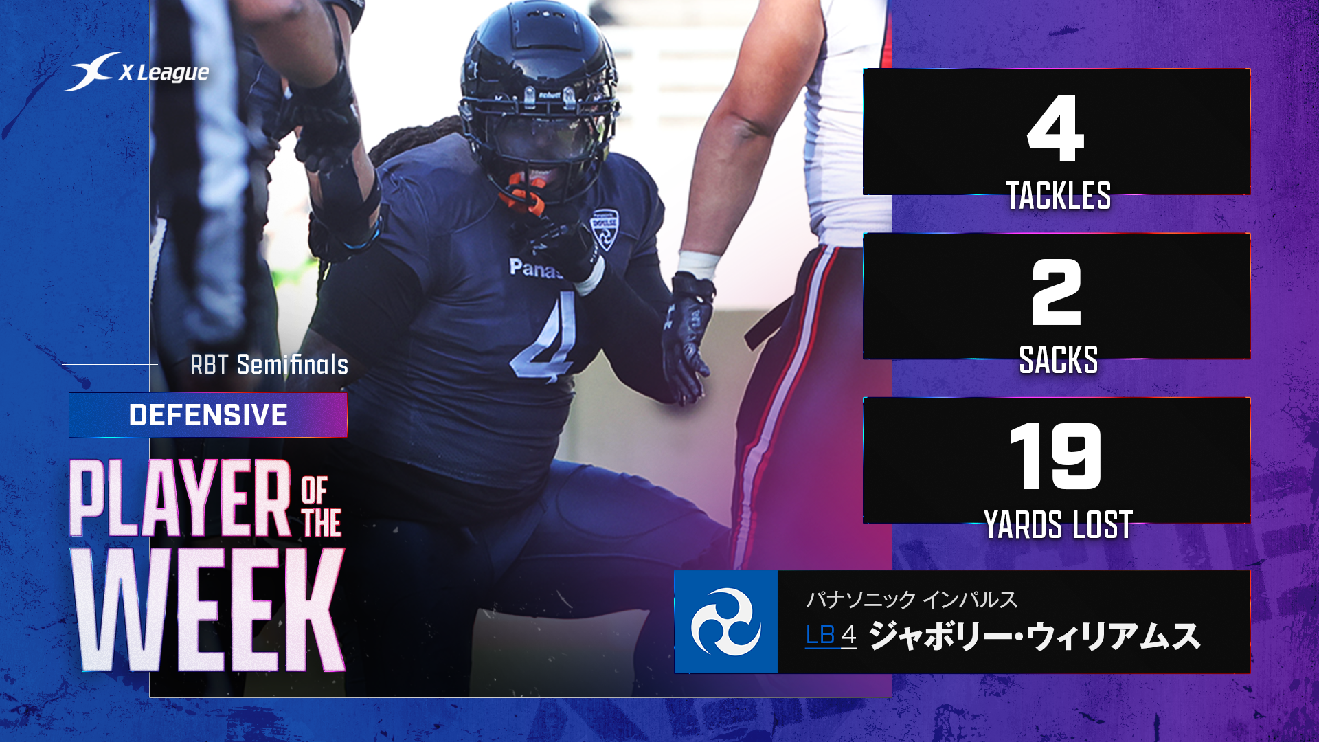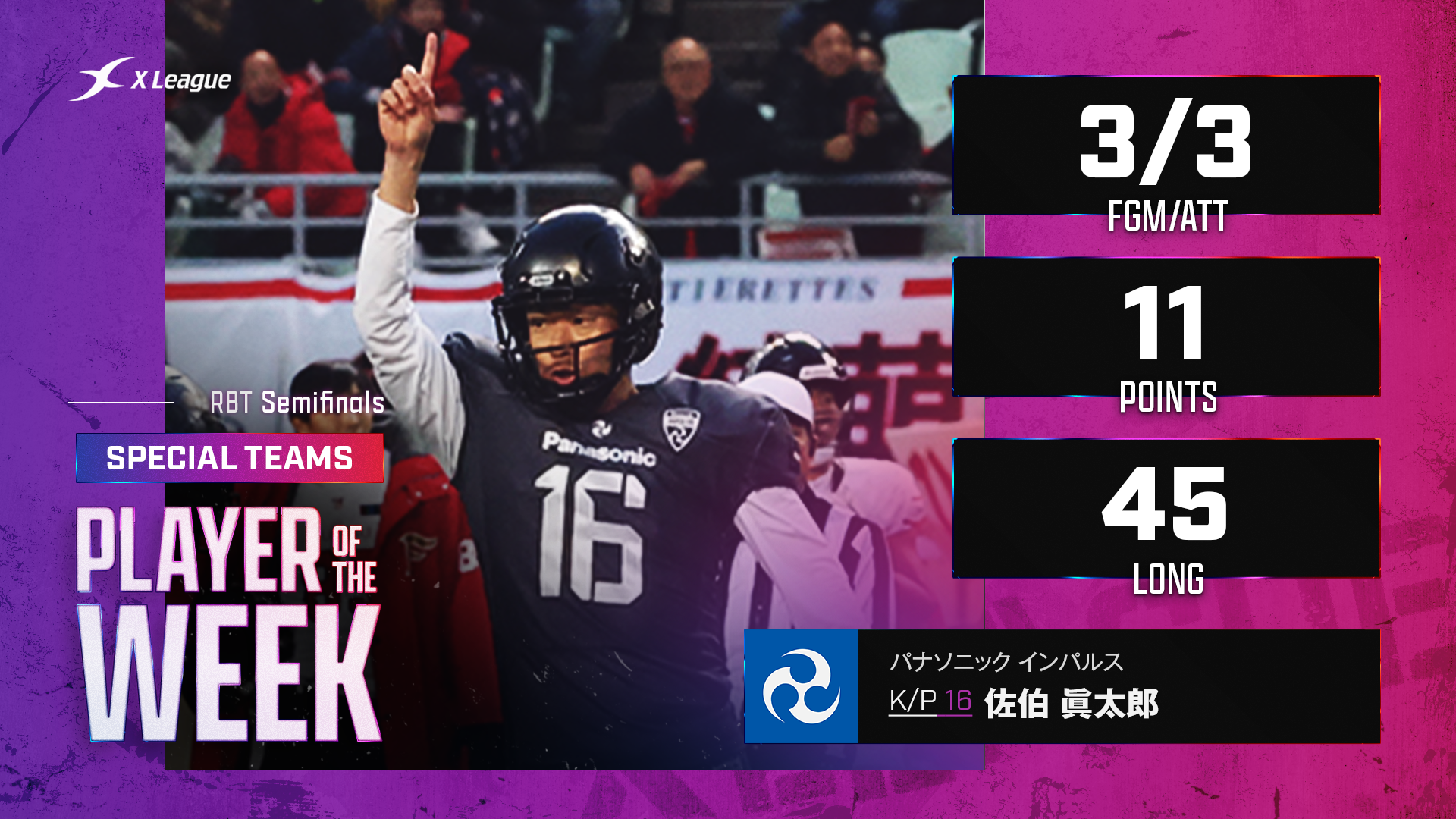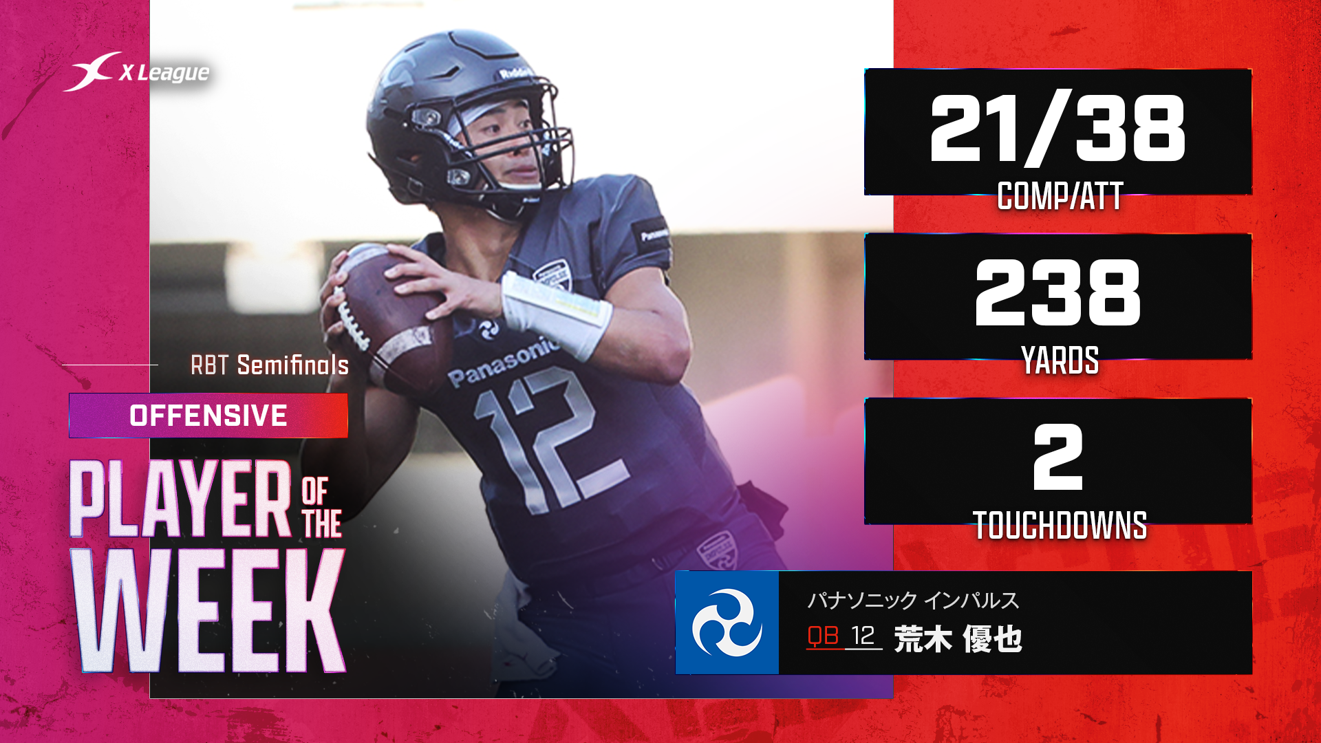 2025年12月19日(金) 18:00第79回ライスボウル(2026年1月3日@東京ドーム)の出場チームを決めるライスボウルトーナメントセミファイナルは13‐14日にかけて2試合が行われ、昨年王者のパナソニック インパルスとオービックシーガルズがそれぞれ勝ち進みました。今季の最後の週間MVPは全部門をパナソニックが独占。対象がセミファイナルに出場した4チームに絞られていたとはいえ、単独チームが4部門すべてを占有するのはX1 Superの週間MVP表彰が始まった2021年以降で初めての快挙です。さらに、Play of the Weekは選考するXリーグ解説員の満票で選ばれました。