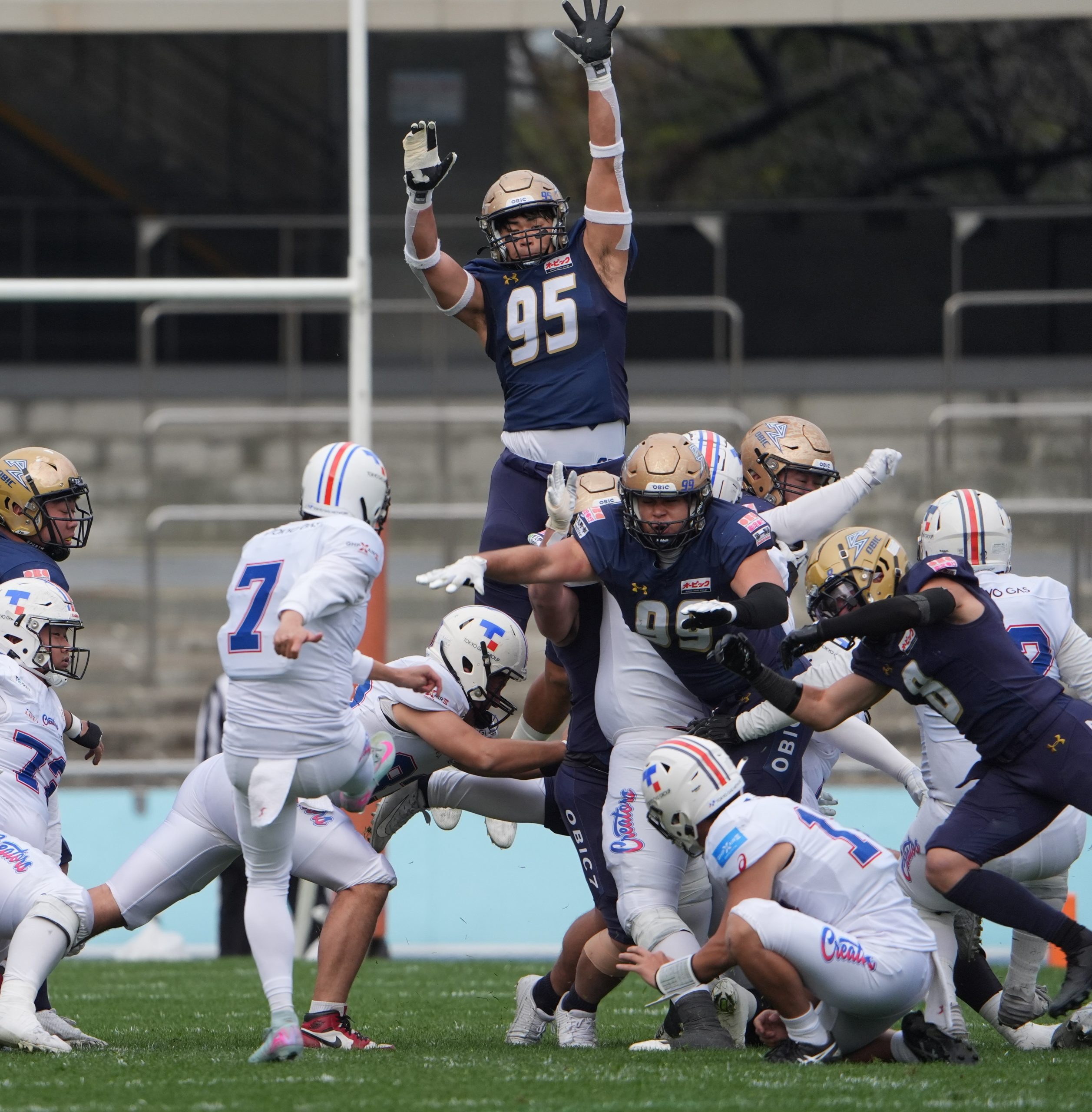 【ジャンプしてキックブロックを試みるオービックシーガルズDL山田琳太郎(背番号95) ©X LEAGUE】