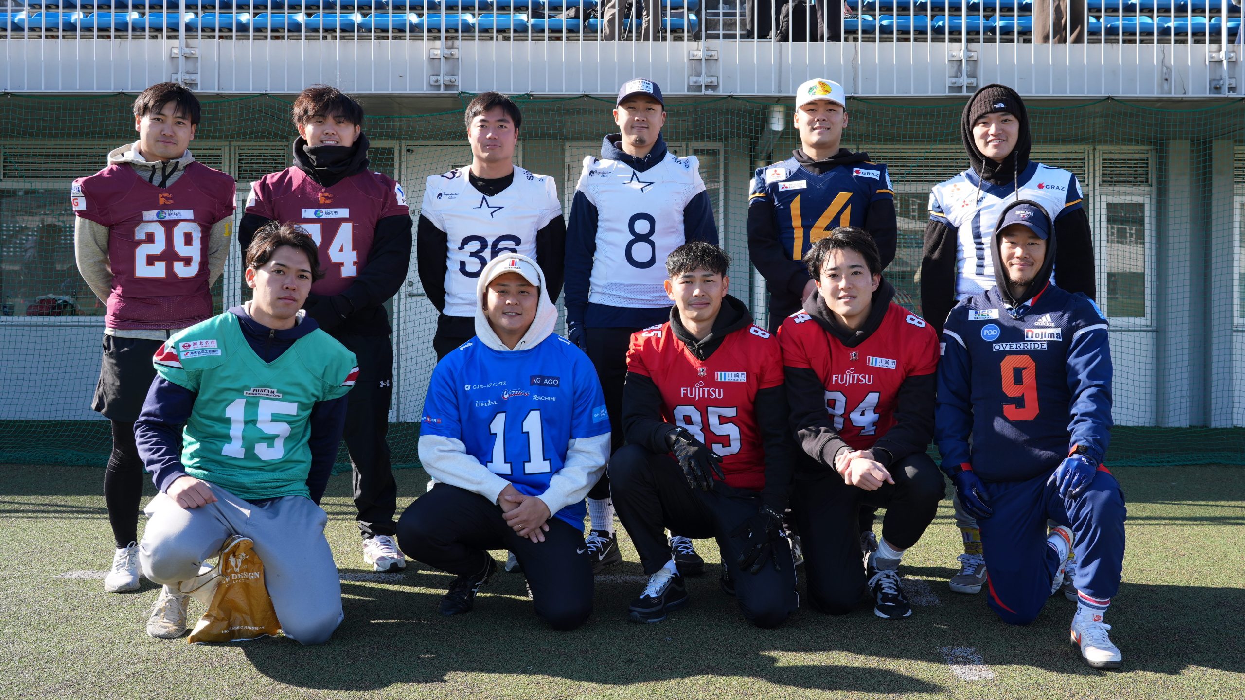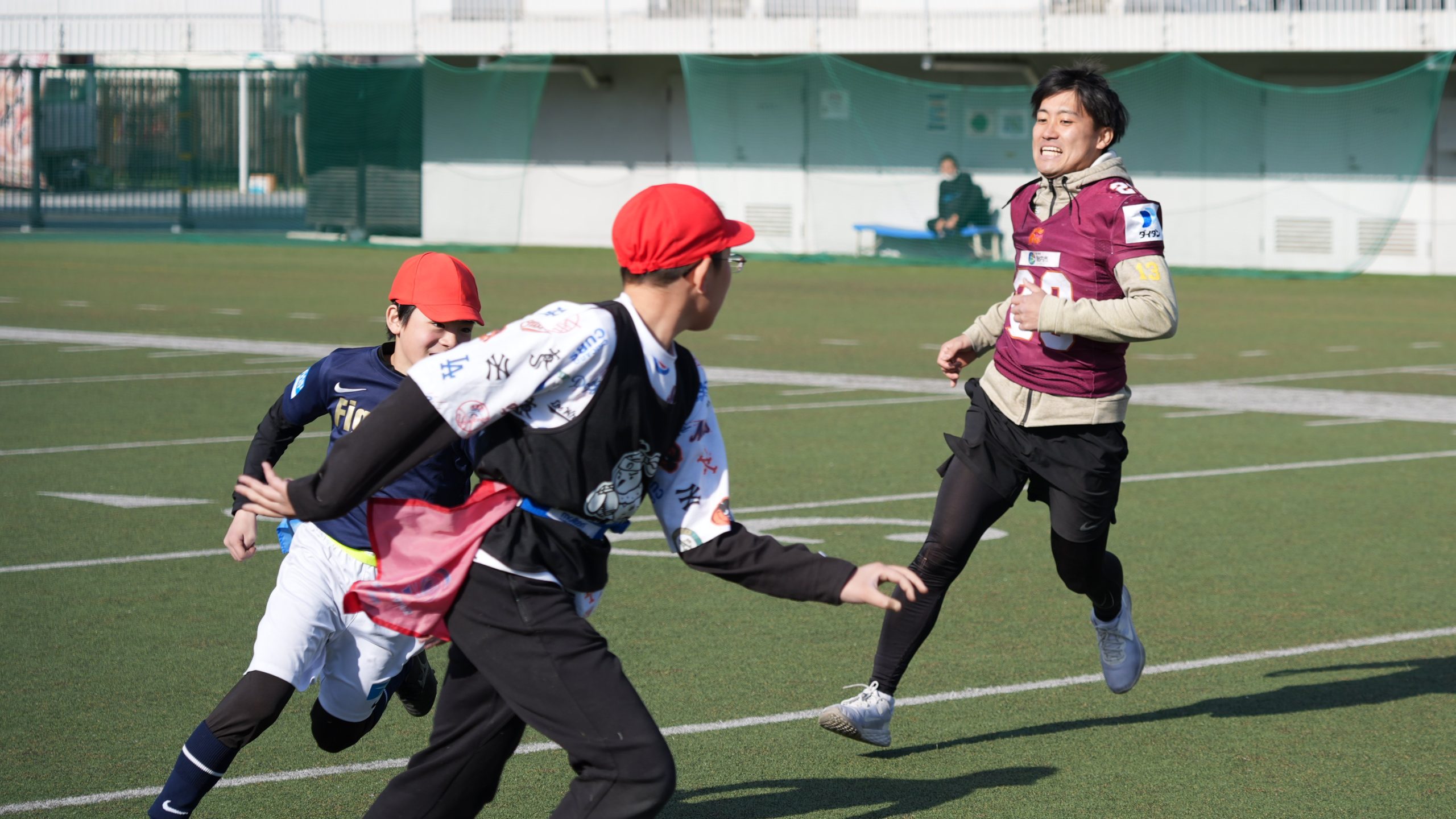今年で13回目を迎えた川崎市恒例の小学生フラッグフットボール大会「藤子・F・不二雄ミュージアムカップ」が1月31日、富士通スタジアム川崎で開催されました。Xリーグからは今年も現役選手が参加し、子どもたちとの交流を深めました。参加したのは東日本所属の7チームから、フラッグフットボール日本代表の松井理己選手(富士通フロンティアーズ)を含む計14名。審判の補佐をしたり、子どもたちにボールの投げ方やキャッチのテクニックを教えたりして楽しい時間を過ごしました。