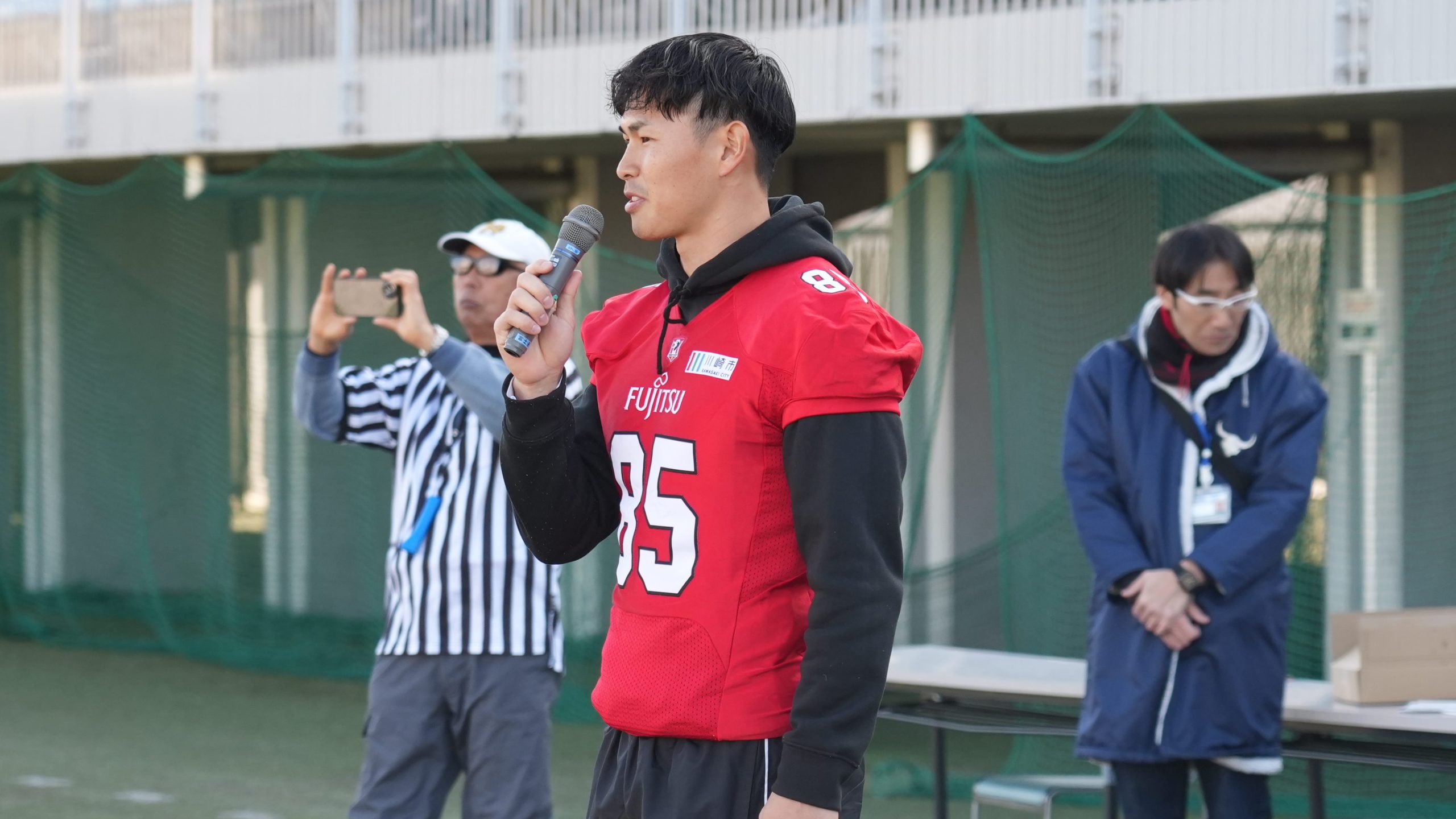【閉会式で大会の講評を述べるフラッグフットボール日本代表で富士通WRの松井理己選手 ©X LEAGUE】