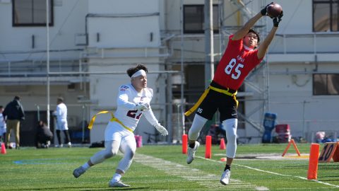 - 【2月に行われたフラッグフットボールXリーグ大会でパスキャッチをする松井理己(右) ©X LEAG... 続きを読む